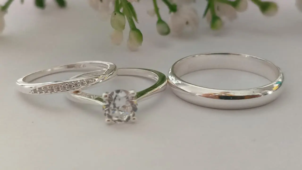 Trío de anillos de matrimonio con circonia en plata 925 – Estilo elegante